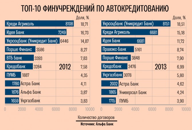 На протяжении всего 2013 г. автокредиты предлагали около 50 кредитно-финансовых учреждений, однако активно кредитованием занимались чуть более десяти банков. В распоряжении «Капитала» оказалась статистика с анализом деятельности основных игроков рынка автокредитования. В 2013‑м лидером стал UniCredit Bank (Укрсоцбанк) — финучреждение профинансировало покупку 8,2 тыс. новых авто, заняв 18,5 % рынка автокредитования. Годом ранее банк занимал третью позицию с долей 14,9 %. Первый заместитель председателя правления UniCredit Bank Сергей Маноха объясняет такой результат новой стратегией банка. «Условия на рынке таковы, что ипотека сейчас не работает, потребительское кредитование мы не развиваем, остается только карточное и автокредитование. Поэтому для нас автокредитование — важный продукт, мы наладили хорошую работу с партнерами (автосалонами)», — говорит банкир.