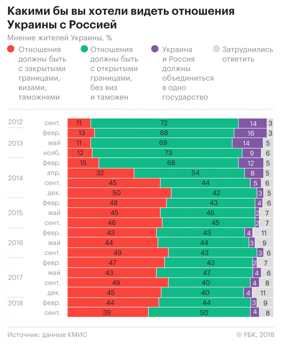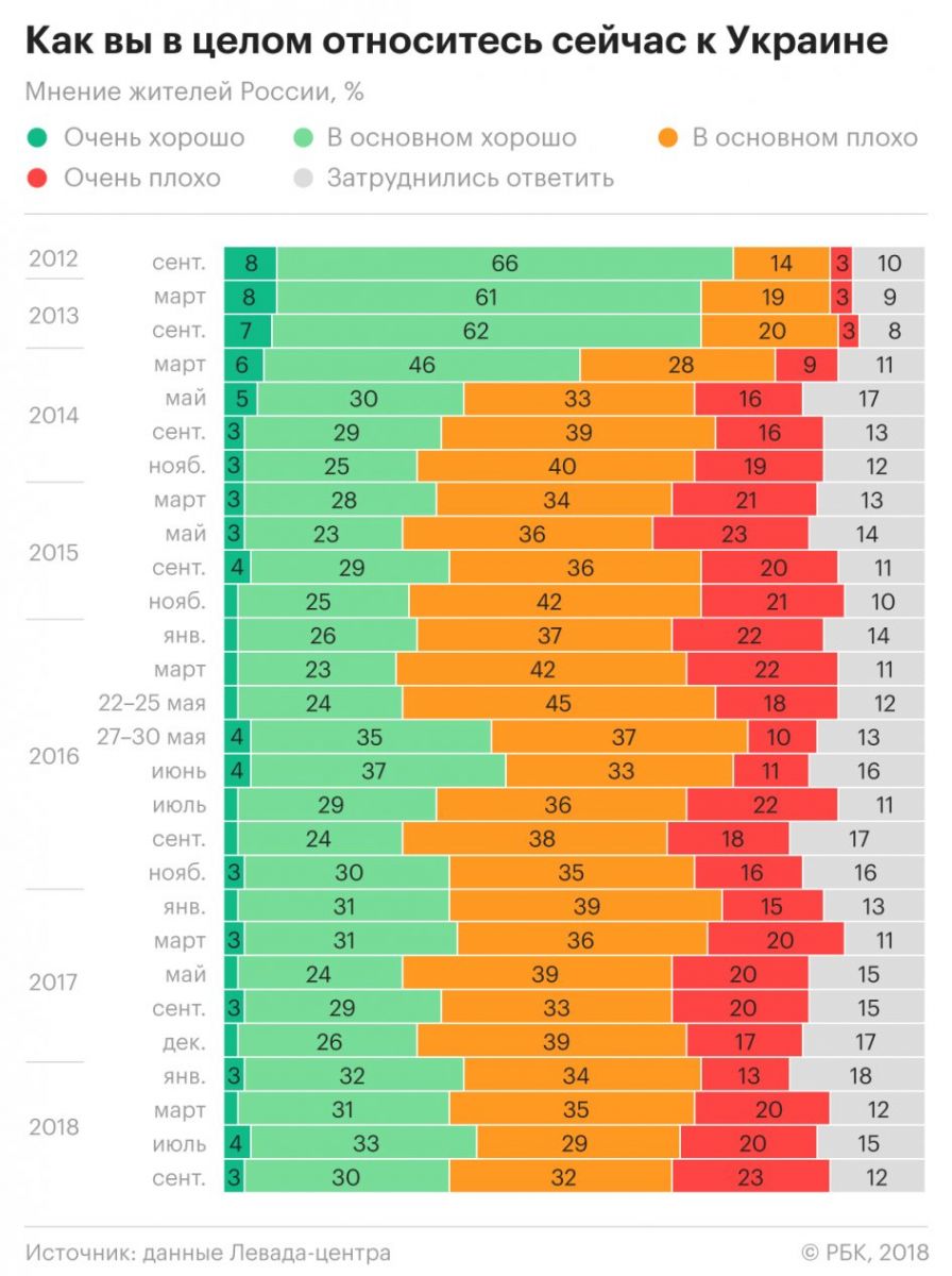 О плохом отношении к России в сентябре 2018 года сказали 32% украинцев, из которых 19% относятся «в основном плохо», 13% — «очень плохо». В прошлом сентябре о плохом отношении к России сказали 46% украинцев.