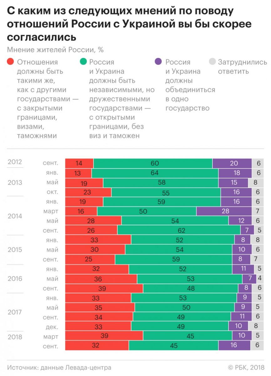 На протяжении многих лет наблюдается асимметрия отношения украинцев к России и россиян к Украине, констатирует руководитель отдела социокультурных исследований Левада-центра. Причем, по словам Алексея Левинсона, в России наблюдается больше негатива не только по отношению к Украине, но и по отношению к другим странам бывшего Советского Союза. Об этом свидетельствуют исследования отношения к разным странам СНГ. Социолог предполагает, что это может быть связано с тем, что россияне воспринимают все страны СНГ как «совершившие предательство» и покинувшие СССР. «Я бы не сказал, что в данном случае это специфически антиукраинские настроения. Они, безусловно, присутствуют и усилены пропагандой, которую вели в период активных боевых действий наДонбассе, но они тут не главное», — считает эксперт.