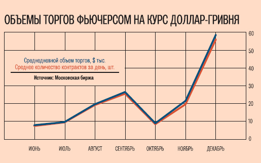 За полгода с момента запуска фьючерса доллар-гривня на Московской бирже общий объем торгов составил $ 3,06 млн (25,05 млн грн), сообщили «Капиталу» в пресс-службе Московской биржи (МБ). При этом среднедневной объем торгов этим деривативом вырос на конец декабря до $ 58,61 тыс. (480,58 тыс. грн), а среднедневное количество сделок — до 56.