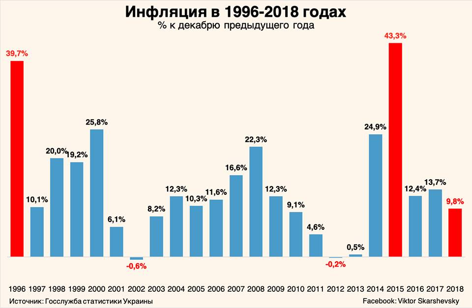 Правительство и Нацбанк отчитались, что в 2018 году инфляция была самой низкой за последние 5 лет — 9,8% декабрь 2018 к декабрю 2017. При этом забыли напомнить, что в 2015 году инфляция была самой высокой (43,3%) за последние 20 лет, т.е. с 1996 года (39,7%). При этой власти цены в 2015 году выросли на рекордную величину с момента введения гривны в 1996 году.