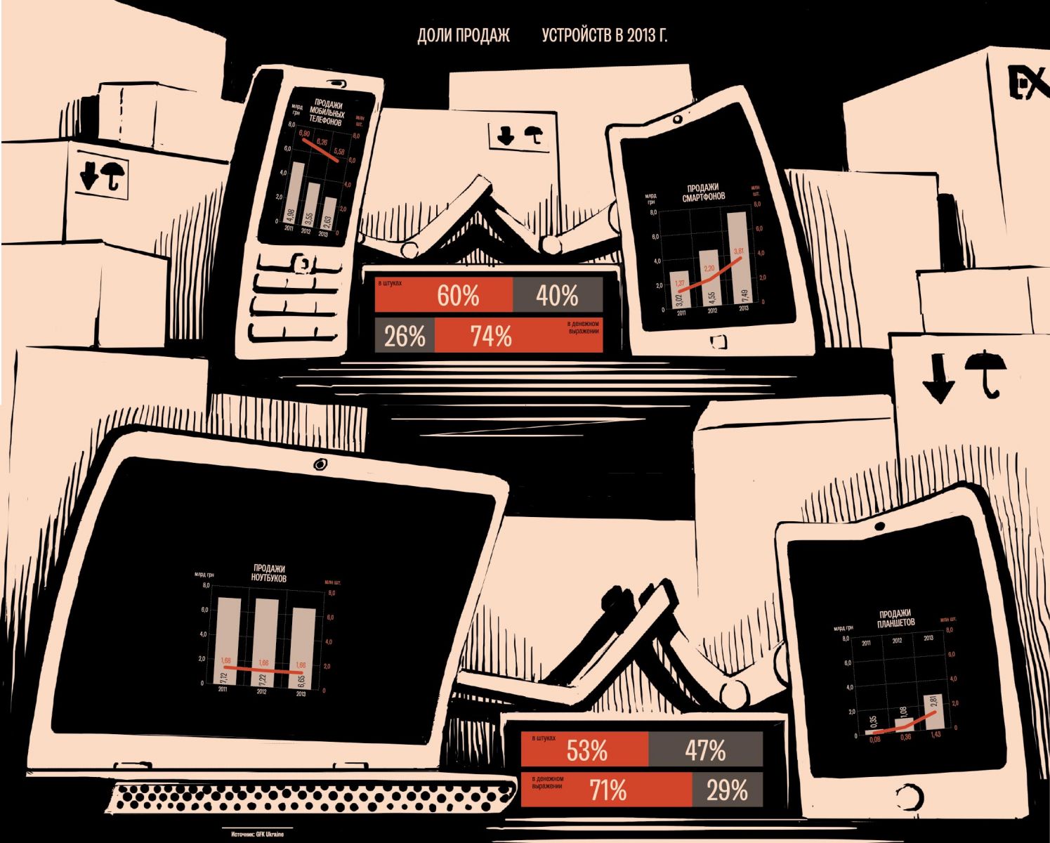 В 2013 г. украинский рынок мобильных устройств — телефонов, смартфонов, планшетов и ноутбуков — составил в общей сложности более 12,4 млн единиц (на 19,5 млрд грн). Это на 20 % больше, чем в 2012 г. и в натуральном, и в денежном выражении.