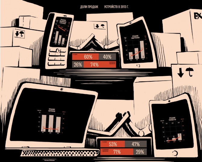 В деньгах отрасль выросла благодаря рекордным продажам смартфонов. Пользователи стали меньше покупать гораздо более дешевые обычные мобильные телефоны, предназначенные в основном для звонков, и стали отдавать предпочтение двухсимникам, чтобы экономить на услугах связи. Рынок портативных компьютеров при этом тоже заметно вырос в натуральном выражении благодаря популяризации планшетов, но в денежном прибавил незначительно.