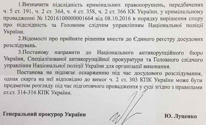 Следовательно, полагают в бюро, Луценко нарушил статью 216 УПК относительно подследственности и статью 36 УПК, которая запрещает передавать подследственные НАБУ дела другим стражам порядка.