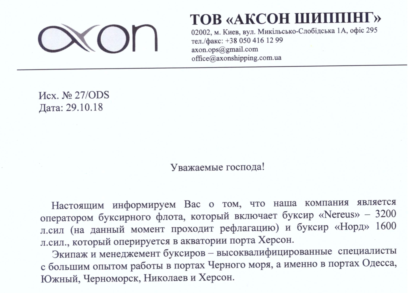«Аксон Шиппинг» еще в ноябре прошлого года разослала своим клиентам письмо о том, что является оператором буксирного флота и оперирует двумя буксирами: Nereus и Норд. Последний, согласно письму, оперирует в Херсонском морском порту. При этом он числится в списке портофлота ГП МТП «Южный» и, по информации участников рынка, взят у госпредприятия в почасовую аренду.