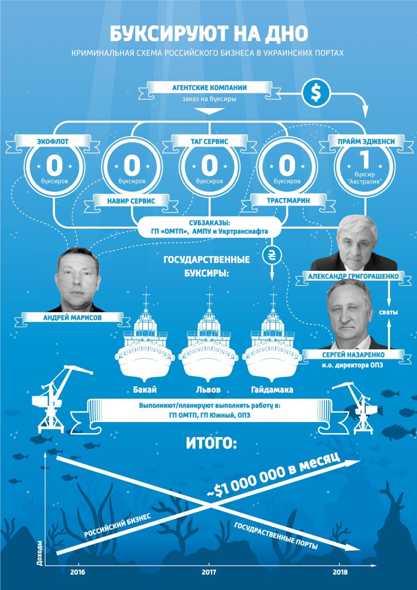 Одесский припортовый завод, который совсем недавно был одним из масштабнейших промышленных предприятий в регионе, а сейчас прозябает в долгах, оказался в центре коррупционного скандала. Сергей Назаренко, директор завода, вступил в сговор с нечистоплотным бизнесменом Андреем Марисовым, чтобы помочь фирме своего сына реализовать в Южном порту незаконную схему с буксирами. Для этого «партнерами» создана фирма-прокладка ООО «Трастмарин».