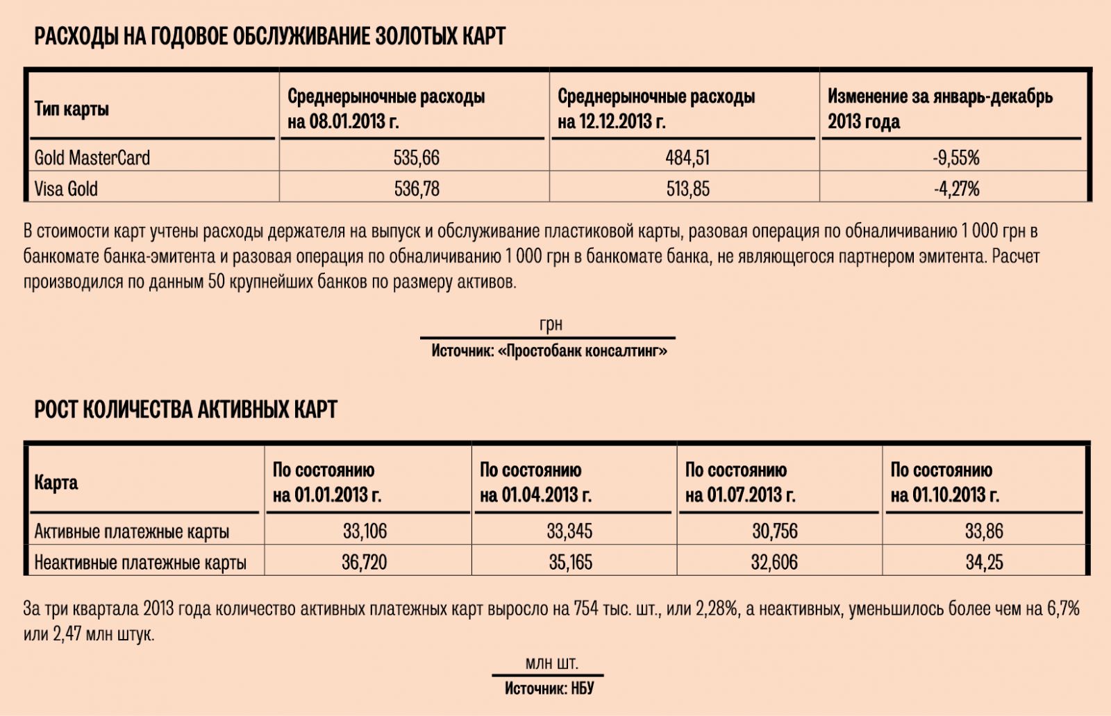 В 2013 г. украинские банкиры наперебой призывали украинцев перейти на золотые карты. Например, VAB Банк к собственному дню рождения предложил более лояльные требования для их получения. А Альфа-Банк запустил ТВ-ролик, в котором в роли держателя золотых карточек выступил… простой фермер. Свою акцию провела и платежная система Visa.
