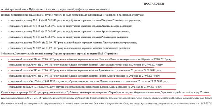 Бенефициаром такой «халатности» стал многомиллиардный налоговый должник - «Укрнафта» Игоря Коломойского. Несмотря на норму, которая прямо запрещала выдавать спецразрешения налоговым должникам, Укрнафта все же стала их обладателем благодаря вышеупомянутой «рабочей» схеме. Суд установил, что Госгеонедра нарушили порядок и сроки отказа и обязал выдать спецразрешения.