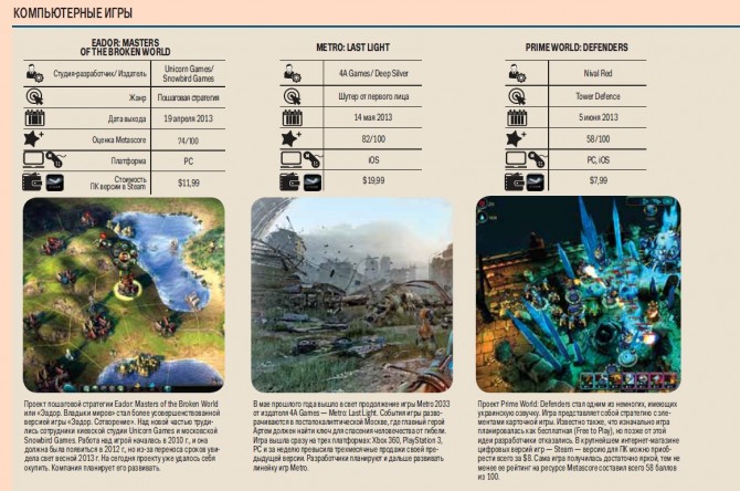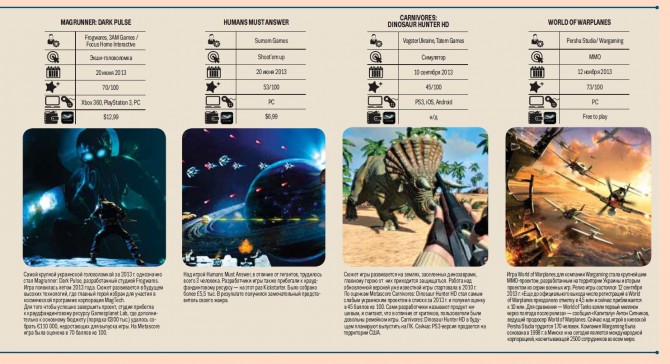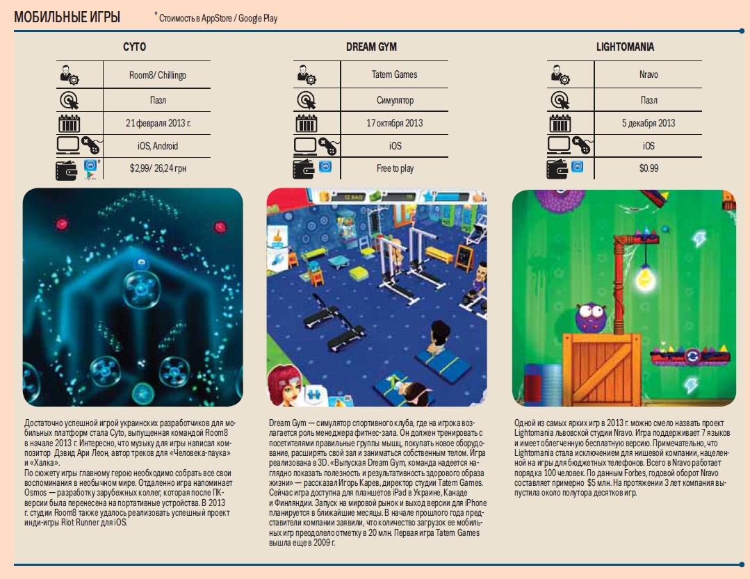 Для украинской игровой индустрии 2013 г. стал знаковым: местные студии выпустили 7 больших игр для ПК, Xbox и PlayStation 3, рассчитанных на глобальные рынки (для сравнения: в предыдущие годы выходило по 2‑3 игры). Кроме того, в этот год появились также десятки мобильных и социальных игр, разработанных украинцами.