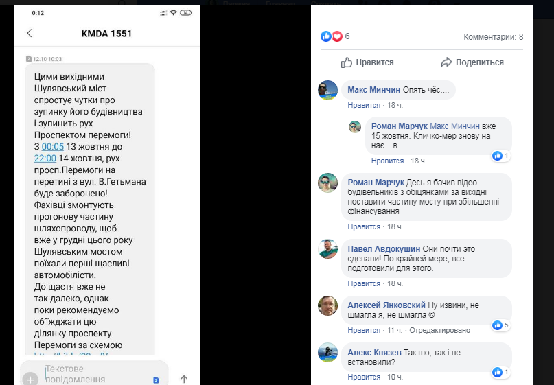 После длительного «застоя» в строительстве киевская мэрия заранее анонсировала перекрытие движения по проспекту Победы в связи с установкой прогонов Шулявского моста. Информация о том, что в районе затянувшегося строительства будут введены ограничения по движению была размещена на сайте мэрии, в соцсетях, а также в столичных СМИ.