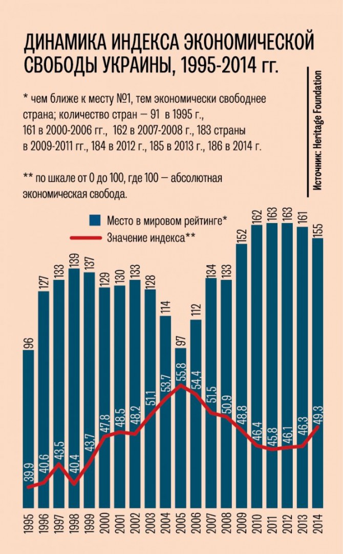 Украина поднялась со 161‑го на 155‑е место среди 186 стран в рейтинге Index of Economic Freedom 2014, который готовит американский исследовательский институт Heritage Foundation совместно с Wall Street Journal. Продвижение на шесть позиций вверх произошло благодаря улучшениям в половине из десяти сфер, которые учитывают авторы исследования. Тем не менее, Украина пока остается в числе несвободных экономик с условиями, которые подавляют развитие бизнеса. Оценка ее экономической свободы улучшилась лишь на 3 балла — до 49,3 балла по 100‑балльной шкале, из‑за чего страна по‑прежнему замыкает рейтинг 43 стран Европы, где этот показатель составляет в среднем 67,1 балла. Опережают нашу страну не только страны Старой Европы и новички Евросоюза, но и многие постсоветские республики, в том числе Армения (41‑е место), Казахстан (67‑е), Молдова (110‑е) и Россия (140‑е).