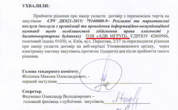 Тендер на 199 тысяч за «Услуги по организации и проведению информационно-коммуникационной кампании относительно особенностей осуществления права собственности в многоквартирных домах» был объявлен ЦПКИ 16 октября. А уже 29 октября был выбран победитель конкурса публичных закупок — ООО «АДВ МГРУП», которое предложило информировать киевлян об их правах собственности за 191 880 тысяч гривен.