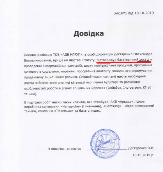 При этом в документации предприятия, которое уже систематически выигрывает тендеры ЦПКИ, есть одна «закавырочка». Так, по условиям публичных торгов, участники должны иметь документально подтвержденный опыт выполнения аналогичного договора. И «АДВ МГРУП» предоставляет справку о своем «многолетнем опыте проведения информкампаний».