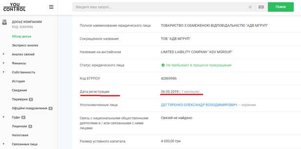 И все было бы ничего, однако о «многолетнем опыте» заявляет фирма, которая была создана всего семь месяцев назад. Так на сайте аналитической системы YouControl указано, что ООО «АДВ МГРУП» зарегистрировано 6 марта 2019 года с размером уставного капитала всего в четыре тысячи гривен.