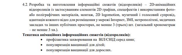 Согласно тендерной документации, исполнитель должен изготовить информационные ролики на тему рака молочной железы, вакцинации и ВИЛ/CПИДа, а также обеспечить их размещение и продвижение в соцсетях. При этом на тему рака необходимо создать один 3-минутный ролик для учреждений здравоохранения, а также его короткую версию для продвижения в соцсетях, и не менее трех анимационных роликов на темы детской и взрослой вакцинации и профилактики ВИЛ.