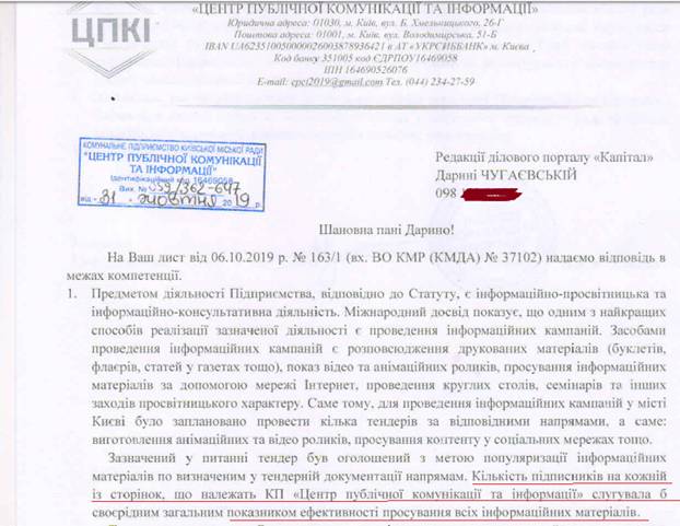 «Капитал» уже давно и трепетно следит за тендерами Центра коммуникации, и мы регулярно отправляем запросы в КГГА и Киевсовет по поводу его деятельности. В ответе на вопрос о пресловутом тендере на 2,5 млн в ЦПКИ пояснили, что увеличение количества подписчиков необходимо для измерения эффективности работы Центра.