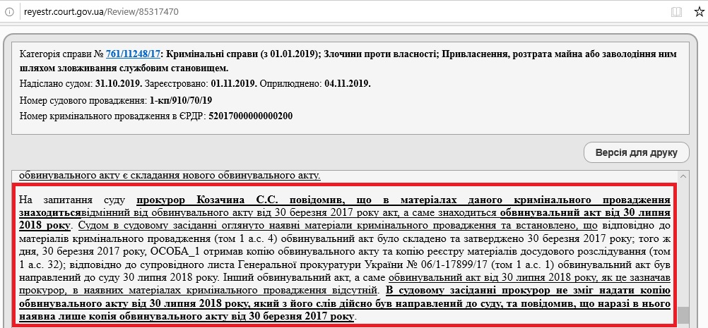В судебном заседании Козачина пояснял суду, что это два разных акта (отклоненный раньше и новый, который подан в ВАКС), но по факту так и не смог предоставить новый документ. То есть фактически обманул судью прямо в заседании. В результате суд не дал ввести себя в заблуждение и отказал в утверждении «липового» обвинительного акта. Все это описано в судебном постановлении.