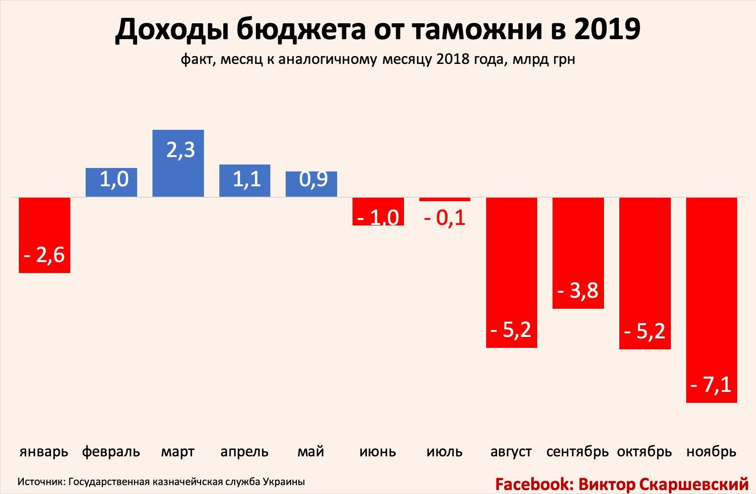 Более того, доходы от таможни в январе-ноябре 2019 ниже фактических доходов за аналогичный период 2018 — минус 19,6 млрд грн.