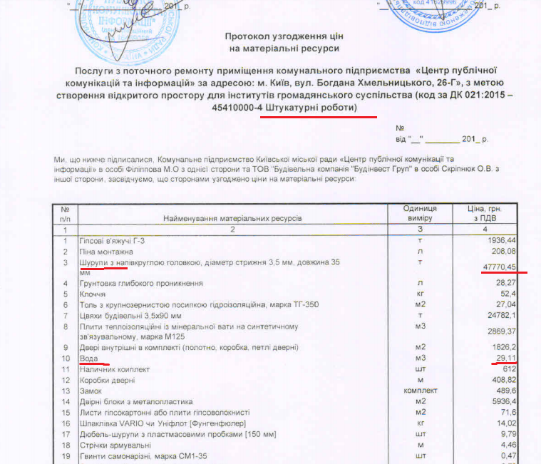 Ко всем подписанным договорам на строительство вместо указания четких объемов работ прилагается один и тот же протокол согласования цен. Так, в договоре на штукатурные работы в прайсе указана цена шурупов в почти 50 тысяч за тонну, а также вода — по цене 29 грн за куб. К чему для штукатурки стен закупать тонну шурупов, и уж тем более, зачем покупать воду, если в помещении имеется собственный водопровод, в тендерной документации не указано.