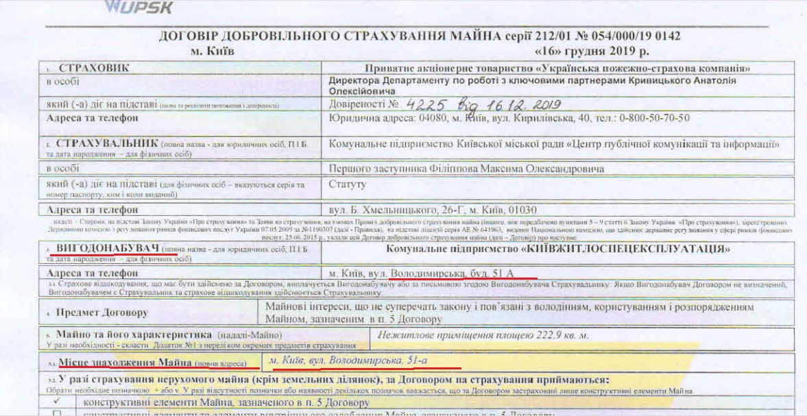 Юридический адрес коммунального предприятия «ЦПКИ» — ул. Б. Хмельницкого, 26-Г, физический — ул. Владимирская, 51-Б. При этом страхует предприятие нежилые помещения общей площадью 1133,3 кв. м, в том числе — и на Владимирской, 51-А, где зарегистрировано КП «Киевжилспецэксплуатация» — оно же, по договору о страховании, является выгодоприобретателем.