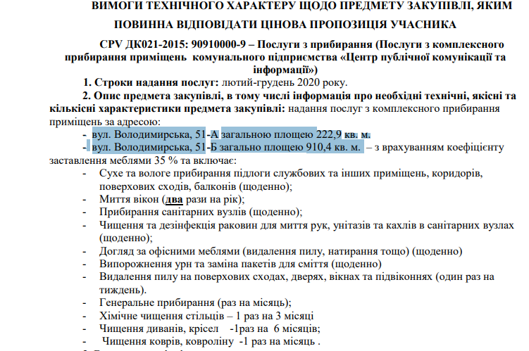 На уборку своих помещений площадью в более тысячу квадратов Центр публичной коммуникации и информации объявил тендер на почти 200 тысяч гривен. При этом клиниговые услуги заказаны по адресам Владимирская, 51-А и 51-Б.