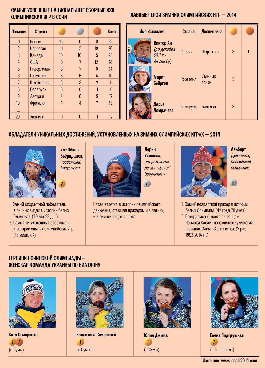 Главными героями завершившейся Олимпиады стали трехкратные олимпийские чемпионы Сочи: российский шорт-трекист Виктор Ан (до декабря 2011 г. — южнокореец Ан Хён Су), норвежская лыжница Марит Бьёрген и белорусская биатлонистка Дарья Домрачева.