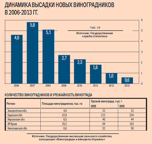 Согласно данным Государственной службы статистики, площадь плодоносящих виноградников в прошлом году составила 67,1 тыс. га против 67,9 тыс. га в 2012 г. Посадка молодых насаждений в результате прекращения финансирования (за счет 1,5 %-го сбора на развитие виноградарства, садоводства и хмелеводства) сократилась до 0,6 тыс. га. В 2013 г., по данным Министерства аграрной политики и продовольствия, из госбюджета на дотации виноделам было выделено 165 млн грн из запланированных 915 млн грн.