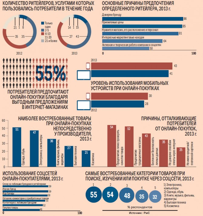 Более половины (55 %) потребителей предпочитают покупать товары через интернет, поскольку с его помощью можно найти наиболее выгодные предложения. Таковы результаты исследования «Global Total Retail Survey 2013», проведенного транснациональной аудиторской компанией PricewaterhouseCoopers (PwC). Эксперты опирались на результаты проведенного в августе-сентябре прошлого года опроса более 15 тыс. онлайн-покупателей из 17 стран мира. Цель исследования — изучить потребительские настроения, чтобы помочь предпринимателям в сфере ритейла разработать бизнес-модель, которая будет отвечать требованиям времени и оправдает ожидания клиентов.