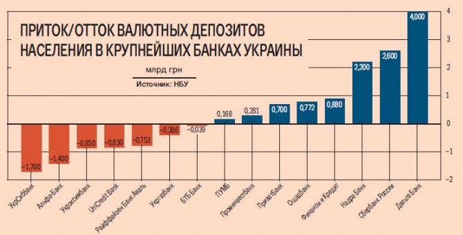 Наибольшее снижение портфелей валютных депозитов населения в прошлом году среди 15 крупнейших банков было отмечено в УкрСиббанке (— 1,7 млрд грн), Альфа-Банке (Украина) (— 1,4 млрд грн), Укрэксимбанке (— 850 млн грн) и UniCredit Bank (— 850 млн грн). Они предлагали самые низкие ставки по депозитам для населения в инвалюте, объясняя это слабым интересом к «дорогим» займам и мерами регулятора. «Банк не активно привлекал валютные депозиты, потому что нормы резервирования НБУ сделали их убыточными», — объяснила начальник управления сбережений и платежей UniCredit Bank Ольга Шостак. Кроме того, по словам Лежнина, большинству банков с иностранным капиталом, в отличие от отечественных, в прошлом году дешевле было привлечь валюту от материнских структур, чем от населения.
