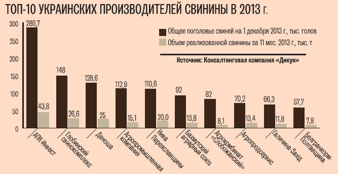 Например, кировоградская промышленная группа «Креатив» намерена увеличить поголовье свиней на  25-30% к 2015 г., до 75-78 тыс., украинско-британское совместное предприятие «Нива Переяславщины» планирует до 2017 г. увеличить мощности по производству товарных свиней в  2,3 раза, до 500 тыс. голов в год, львовская компания «Галичина-Захід» — в 2,4 раза, до 10 тыс. голов, к 2017 г., а ивано-франковская «Даноша» нарастит поголовье свиней на 33-50%, до 400-450 тыс. голов, к 2015 г.