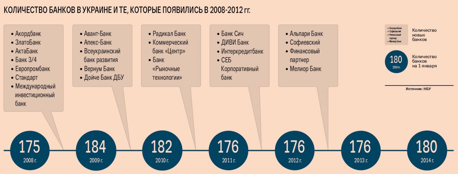 Банковская система Украины в 2013 г. пополнилась семью новыми участниками. На 1 января 2014 г. количество кредитно-финансовых учреждений, имевших банковскую лицензию, выросло до 180. В начале года НБУ зарегистрировал еще один банк — 181‑й. Собственники созданных финструктур не захотели заниматься выбиванием старых проблемных долгов, предпочитая новые бизнес-модели.