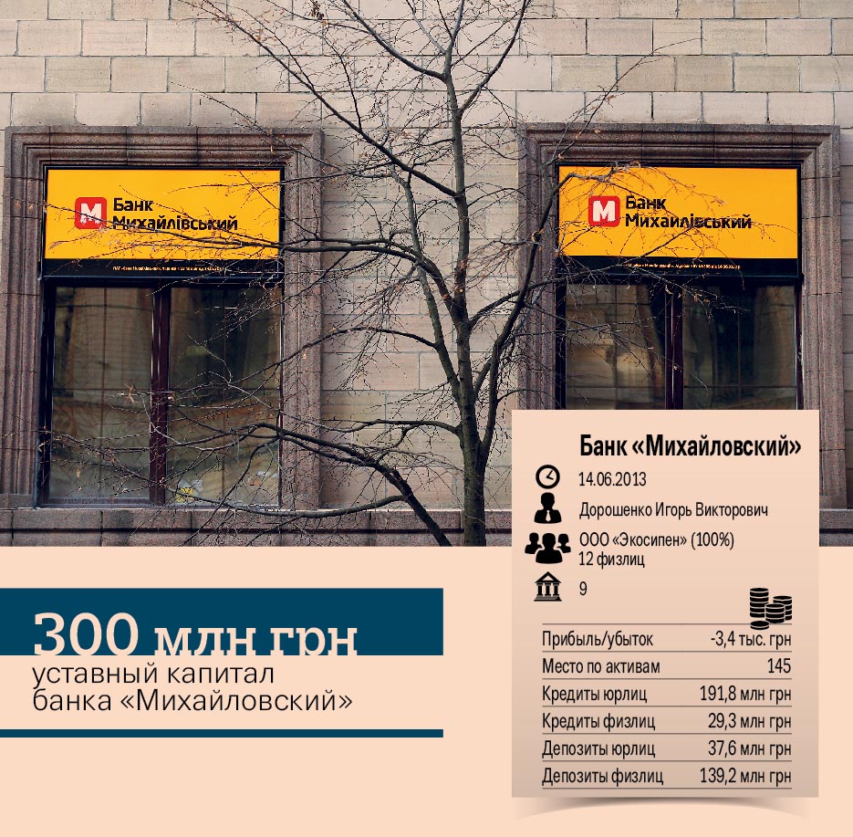В июне 2013 г. на банковский рынок вышел еще один игрок — банк «Михайловский» (Киев). За полгода своей деятельности он успел нарастить активы до 477,6 млн грн, что позволило занять 145‑е место в списке банков. Единоличный акционер «Михайловского» — торговая компания «Экосипан», которая принадлежит нескольким юрлицам. Спустя два месяца после начала работы банк сменил председателя правления: с августа его возглавил один из акционеров «Экосипана», экс-предправления банка «Русский стандарт» Игорь Дорошенко. А первый председатель Николай Конопатский занял должность советника предправления банка «Михайловский». Финучреждение называет себя универсальным, наращивая розничную сеть отделений и мини-офисов в торговых центрах столицы. Но пока корпоративный кредитный портфель «Михайловского» в шесть раз превышает розничный.