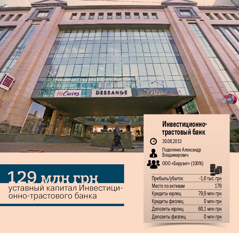 В августе 2013 г. был создан Инвестиционно-трастовый банк (Киев), сегодня он 129‑й по размеру активов. Инвестором выступает торговое предприятие «Бируанг», учрежденное рядом физлиц. Председателем правления банка назначен бывший советник предправления банка «Рыночные технологии» Александр Подолянко. Ранее он подтверждал, что финучреждение будет развиваться одновременно как розничное и корпоративное. Но как следует из финансовой отчетности, банк не кредитовал население и средства у физлиц не занимал.