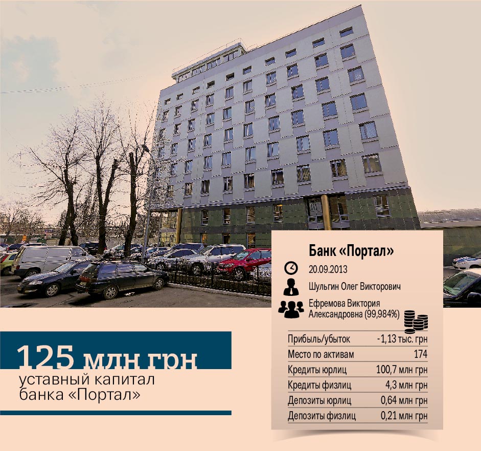 Аналогичным путем пошел начавший свою работу в сентябре 2013 г. банк «Портал», который занимает 125‑е место по размеру активов, а его корпоративный кредитный портфель в 23 раза превышает розничный. Спустя месяц после получения банковской лицензии финструктура заключила свой первый серьезный кредитный договор. В октябре банк открыл возобновляемую кредитную линию в 30 млн грн компании «Киевгорстрой-2». Руководит «Порталом» бывший предправления ТММ-Банка Олег Шульгин (в апреле 2013 г. переименован в Финанс Банк, также использовался для обслуживания девелоперско-строительной компании «ТММ-Холдинг»). Акционером банк «Портал» является Виктория Ефремова, которой принадлежит 99,984 % акций, сообщает финучреждение.