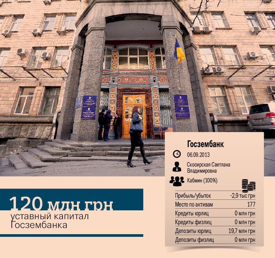 А вот руководству созданного в сентябре 2013 г. Госзембанка (Киев) со специализацией определяться нет необходимости. Его единственный акционер — государство. Управляющая — Светлана Скосырская, ранее возглавлявшая другой госбанк «Киев».