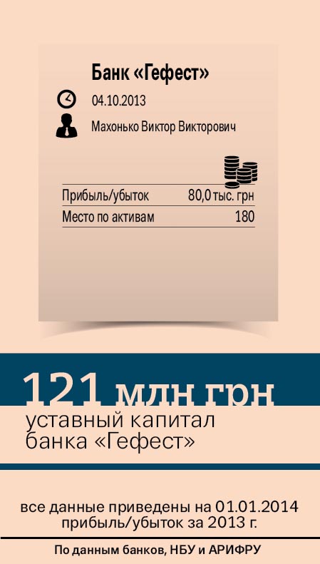 В октябре 2013 г. в Донецке зарегистрировали банк «Гефест», и на 1 января 2014 г. он был последним в списке кредитно-финансовых учреждений. За три месяца деятельности банк лишь успел разместить свои собственные средства в размере 1,6 млн грн в других финструктурах и понести админзатраты на 1,5 млн грн. В результате «Гефест» получил прибыль в 80 тыс. грн, причем ни депозитная, ни кредитная деятельности еще не проводились. Информация об акционерах также отсутствует. Известно только, что председателем правления банка назначен некий Виктор Махонько.