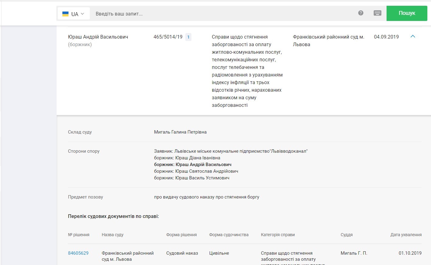 27 сентября 2019 года Франковский районный суд Львова своем решением 465/5014/192-н/465/828/19 постановил взыскать с Андрея Юраша и Дианы Юраш задолженность за водоснабжение в сумме 1 115 гривен 74 копейки в пользу коммунального предприятия «Львовводоканал», а также как проигравшей стороне оплатить 192 гривны 10 копеек судебного сбора.