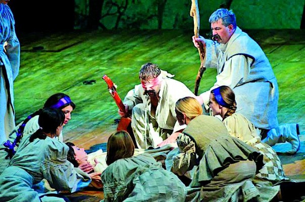 Причудливые герои периодически замирают поодиночке или группами. Такие композиции нам знакомы по старым фотографиям, где наши бабушки и дедушки с пониманием торжественности момента позировали перед объективом специально приглашенного фотографа. Неторопливое течение времени отражено и в специфике перемещения героев по сцене: жители Чистого Дора передвигаются в пространстве, будто в замедленной съемке. Веселье сердечное здесь наполнено торжеством простого и чистого бытия с его страстями и радостями. Как в детстве. Ведь недаром герои истории очень уж напоминают персонажей из детских мультфильмов: добряк дядюшка Зуй (Владимир Горянский), его внучка Нюрка (Оксана Жданова), Пантелеевна (Леся Самаева), новая учительница (Светлана Штанько) — эстетика лубка в разработке персонажей сочетается с тонким поведенческим психологизмом.