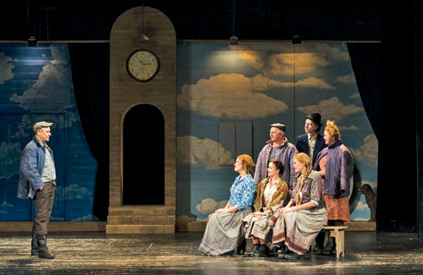 Настроение героев находит свое отражение и в сценографическом решении (художник Петр Богомазов). Задник сцены — лазурное небо с кучками белых облаков. Между огромными солнцем и месяцем, в центре композиции, расположены часы с неподвижной стрелкой. Миропорядок охраняют два пса, несущих стражу по бокам фронтальной композиции. Окна и двери открываются непосредственно в небесной тверди.