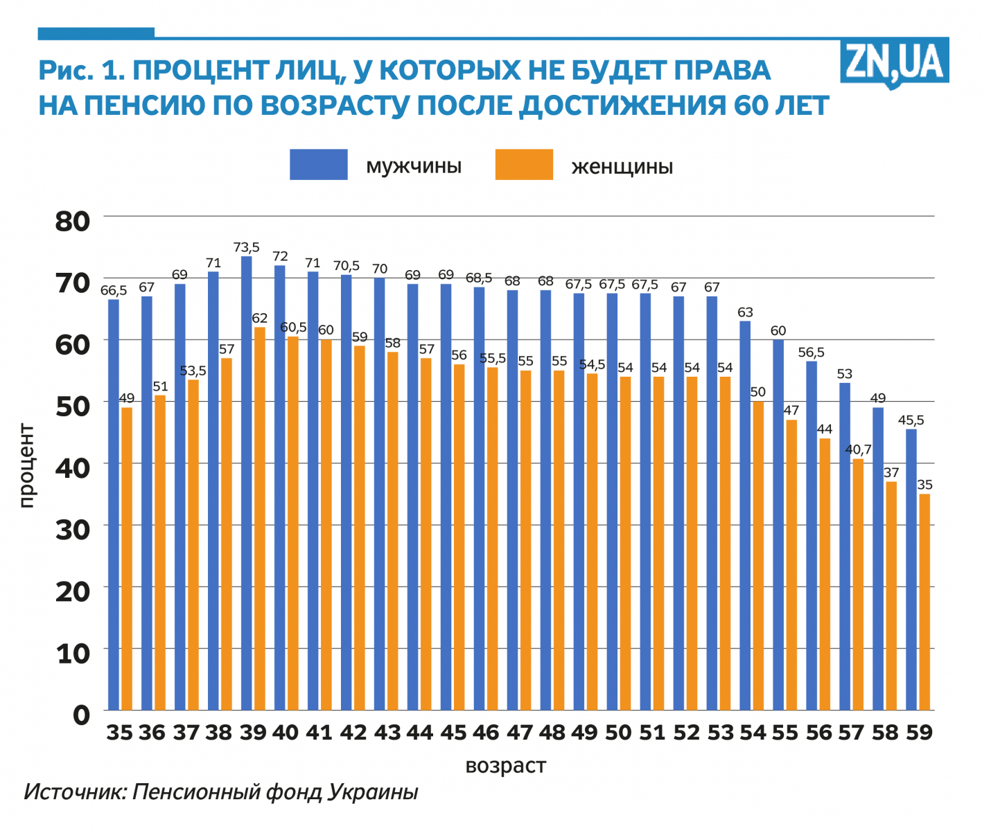 Аналитика ПФУ четко указывает, что количество лиц, которые будут иметь право на назначение пенсионных выплат при достижении определенного законодательством пенсионного возраста, будет постоянно снижаться из-за отсутствия у них необходимого страхового стажа. Так, из всех застрахованных на сегодняшний день лиц в среднем 53% женщин и 65,5% мужчин не будут иметь права на пенсию при достижении 60 лет (см. рис. 1). То есть более чем половине будущих пенсионеров придется работать дольше, чем требует законодательство, и в основном они сами себе подняли свой пенсионный возраст, потому что главная причина отсутствия необходимого стажа — неофициальная занятость.