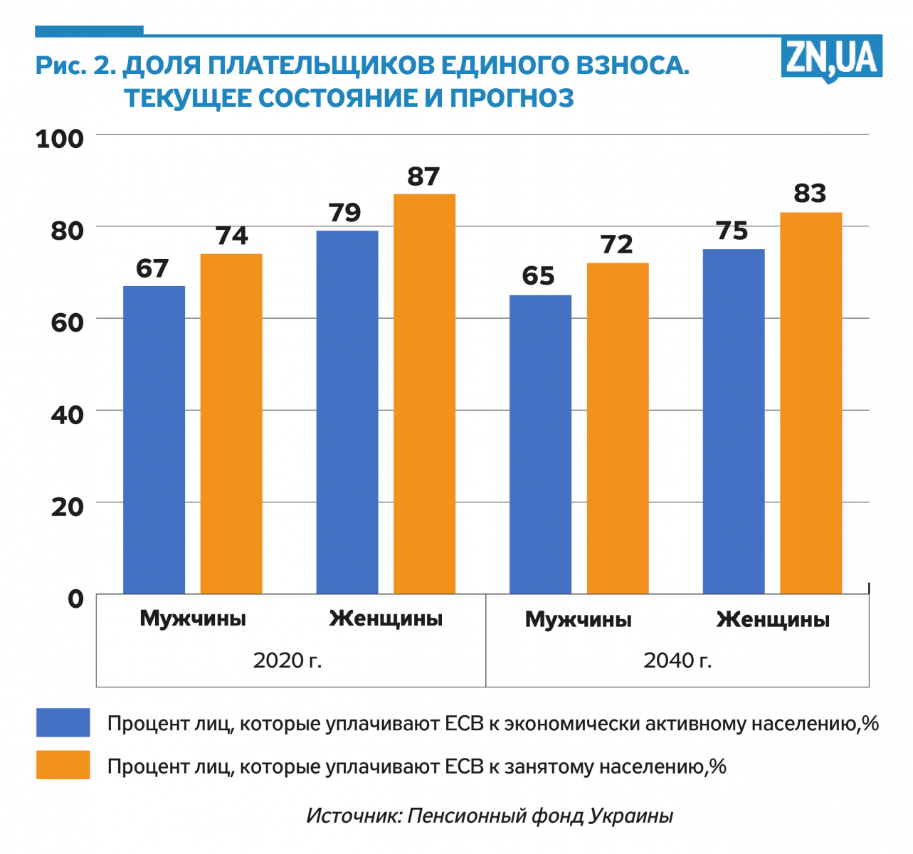 Давайте посмотрим на то, как «тенизация» зарплат уже сейчас негативно влияет на ситуацию. Соотношение количества плательщиков единого взноса к экономически активному населению составляет около 70%, а среди мужчин 25–50 лет — вообще почти 60%. Что еще хуже, к 2040 году прогноз ПФУ не улучшится (см. рис. 2).