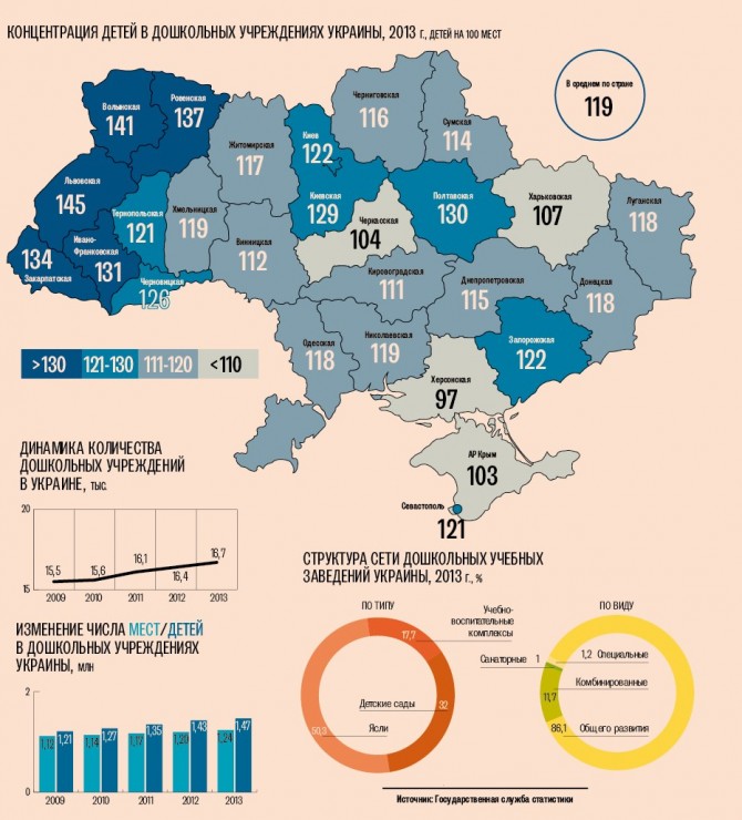 Согласно данным экспресс-выпуска Госстата, по сравнению с 2012 г. средняя концентрация детей в детских садах Украины осталась неизменной — 119 дошкольников на 100 мест. По состоянию на конец прошлого года во всех регионах нашей страны, за исключением Херсонской области (97 детей на 100 мест), учебные заведения для детей дошкольного возраста были переполнены. Наибольшая нагрузка по‑прежнему выпадает на воспитателей в западных областях Украины: Львовская (145 детей на 100 мест), Волынская (141), Ровенская (137), Закарпатская (134), Ивано-Франковская (131).