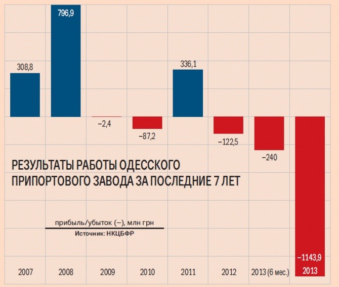 23 апреля акционеры принадлежащего государству Одесского припортового завода соберутся на ежегодное собрание, чтобы обсудить ситуацию на предприятии, которое с 2012 г. стремительно наращивает убытки. Так, согласно сообщению завода, по итогам 2013 г. его убыток достиг 1,1 млрд грн. против 122,5 млн убытка в 2012 г. За первое полугодие прошлого года убыток ОПЗ составил 240 млн грн. Таким образом, отрицательный результат предприятия, подобно снежному кому, наращивается с 2012 г. Лишь в 2011 г. завод сумел заработать прибыль на уровне 336,1 млн грн. впервые после кризиса 2008‑2009 гг.