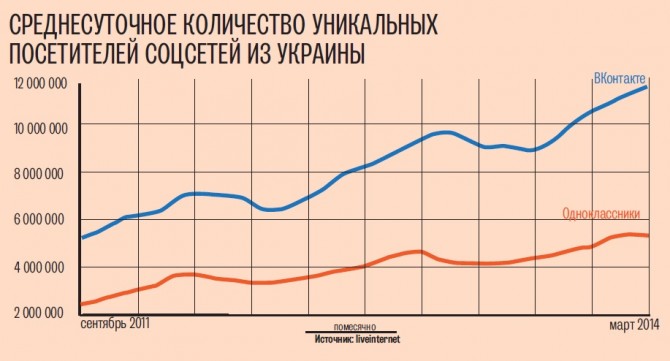 Получить комментарий представителей Mail.Ru Group, которой принадлежит соцсеть «Одноклассники», не удалось. Согласно статистике Liveinternet, в декабре-марте среднесуточная аудитория соцсети из Украины выросла на 10 % — с 5 млн до 5,5 млн. Такие темпы роста сохраняются с мая 2013 г.
