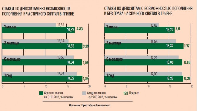 Только в январе-феврале отток средств из банковской системы составил 49 млрд грн, или 7,3 % (исходя из курса 7,99 UAH / USD). По информации СМИ, наибольший отток вкладов наблюдался в ПриватБанке: в феврале из финучреждения население забрало более 6 млрд грн. Чтобы удержать разбегающихся вкладчиков, банк увеличил ставки по гривневым депозитам. «На днях мы повысили ставку по месячным вкладам до 18 % годовых, тогда как раньше предлагали до 13 %», — сообщил пресс-секретарь ПриватБанка Олег Серга.
