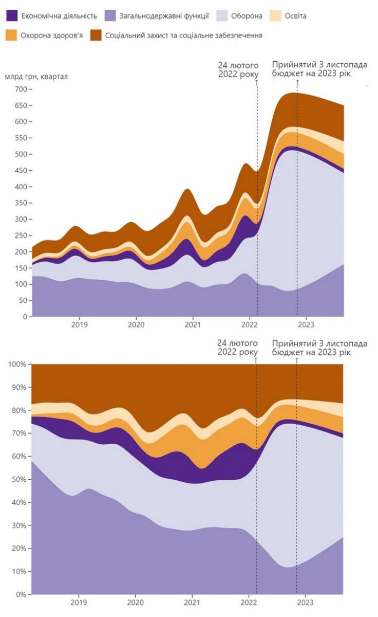 Дані з 2018 року по третій квартал 2022 року – openbudget.gov.ua, за 2023 рік – проєкт бюджету і презентація уряду. На графіку за 2023 рік бюджет рівномірно розподілений поквартально. В інфографіці витрати на оборону та безпеку об'єднані. Низка функціональних витрат (трансфери, обслуговування боргу або "Інше") віднесена до категорії "Загальнодержавні функції".