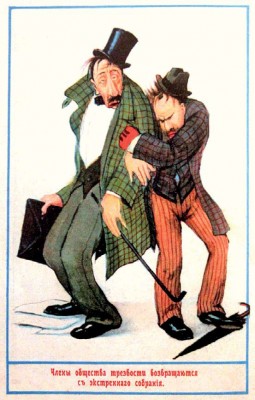 Немало карикатур серии «Русские юмористические открытки» высмеивали чрезмерные возлияния. Пьяниц сравнивали со свиньями, которые попадают во всевозможные комичные ситуации: дергают вместо дверного звонка ручку для слива в туалете или путают чашку, стоящую на бочке с водой, с телефоном. «Как избавиться от красного носа? Пить, пока посинеет», — советует одна из картинок, на которой мужчина стоит перед наполненным стаканом. А персонаж открытки, которого друзья на себе тащат из пивной, мудро изрекает: «Это мои враги говорят, что я человек тяжелый и невыносимый! Смотрите, как легко и торжественно меня выносят друзья!»