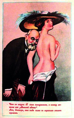 Тогдашнее общество отнюдь не было скромным и пуританским. Хозяева вовсю заигрывали с гувернантками, врачи флиртовали с пациентками, а любовники уже тогда прятались от мужей в шкафу. На одной из открыток: «Что вы здесь делаете?» — спрашивает супруг, обнаруживший в своей спальне мужчину. «Жду поезда». — «Какого поезда ждете вы в шкафу?» — «Поезда, с которым вы должны уехать».