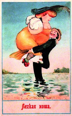 Цены дамских гардеробов огорчали мужчин и сто лет назад. «75 рублей за эту шляпу? — возмущались они. — Да ведь это грех». — «Не беспокойся: этот грех, во всяком случае, падет на мою голову». На одной из открыток муж с юмором отвечает на упреки жены: «Плачь, плачь. Это тебе очень идет. Кстати, из всего, что тебе идет, это мне обходится всего дешевле».