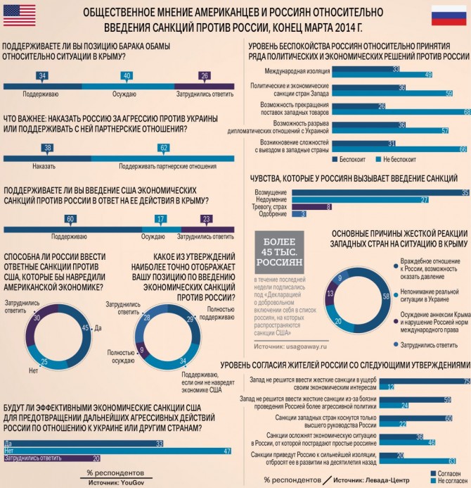 Согласно итогам опроса, проведенного 22‑27 марта 2014 г. исследовательской компанией YouGov, почти каждый второй (47 %) житель США признает, что введенные Белым домом экономические санкции не станут России преградой для ее дальнейших агрессивных действий в отношении Украины или любой другой страны. Несмотря на одобрение большинством (60 %) американского населения санкций против российского руководства, 62 % опрошенных уверены, что США очень важно продолжать поддерживать с Россией партнерские отношения для защиты своих национальных интересов на международной арене.
